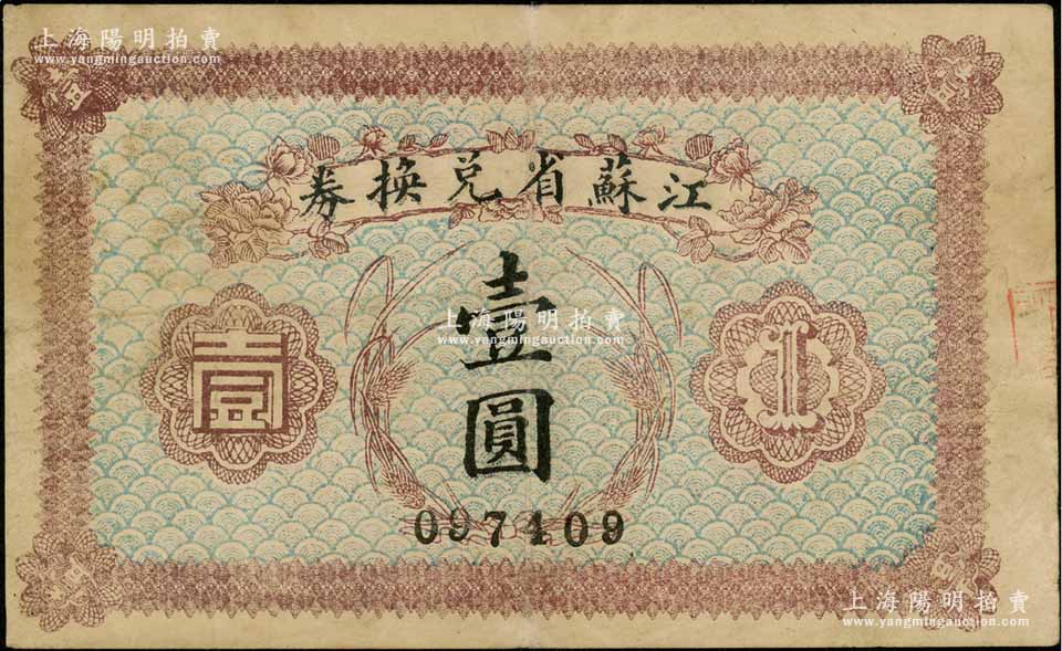 民国十四年(1925年)江苏省兑换券壹圆,八成新
