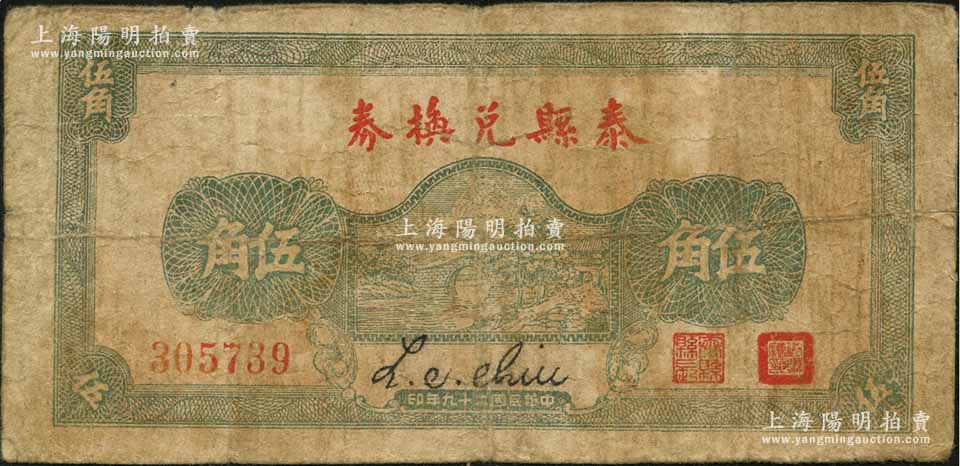 民国二十九年(1940年)泰县兑换券伍角,资深藏家出品,少见,原票七成新