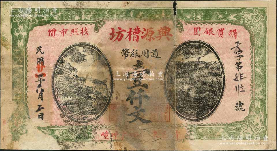 民国廿一年(1932年)兴源槽坊通用纸币壹仟文,江苏徐州府萧县(今属安徽)民间钞票,日本回流品,罕见,原票近七成新
