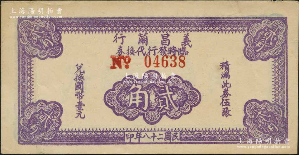 民国二十八年(1939年)义昌茧行临时发行代换券贰角,属抗战时期江苏无锡地方辅币,少见,八五成新