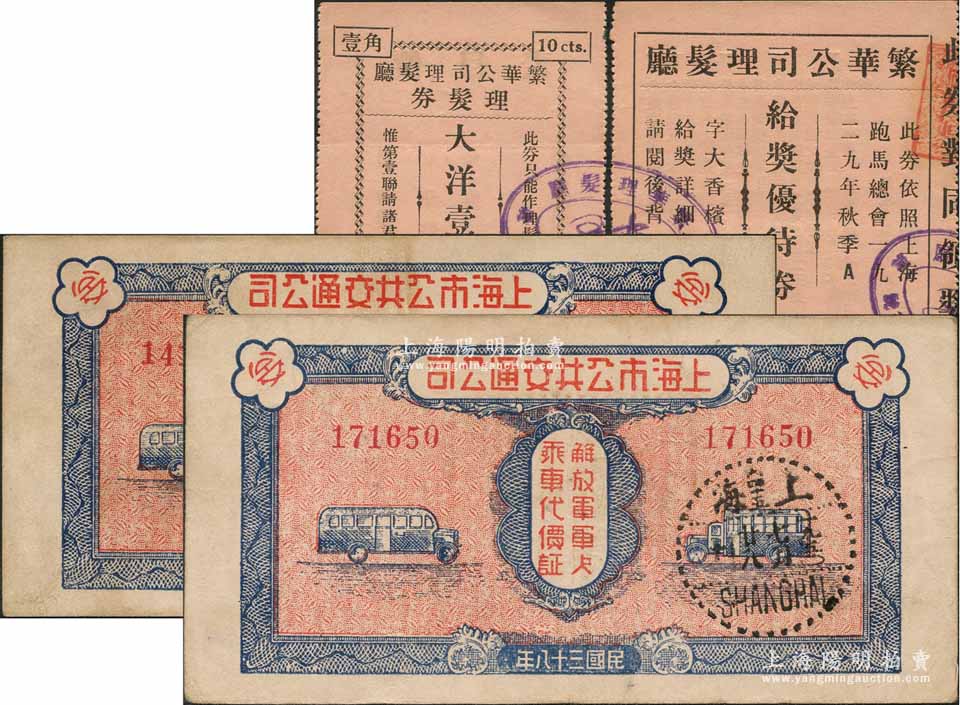 老上海代价券共3枚,详分:1929年繁华公司理发厅给奖优待券,附带理发券大洋壹角;1949年上海市公共交通公司解放军军人乘车代价证2枚;江南藏家出品,八成新