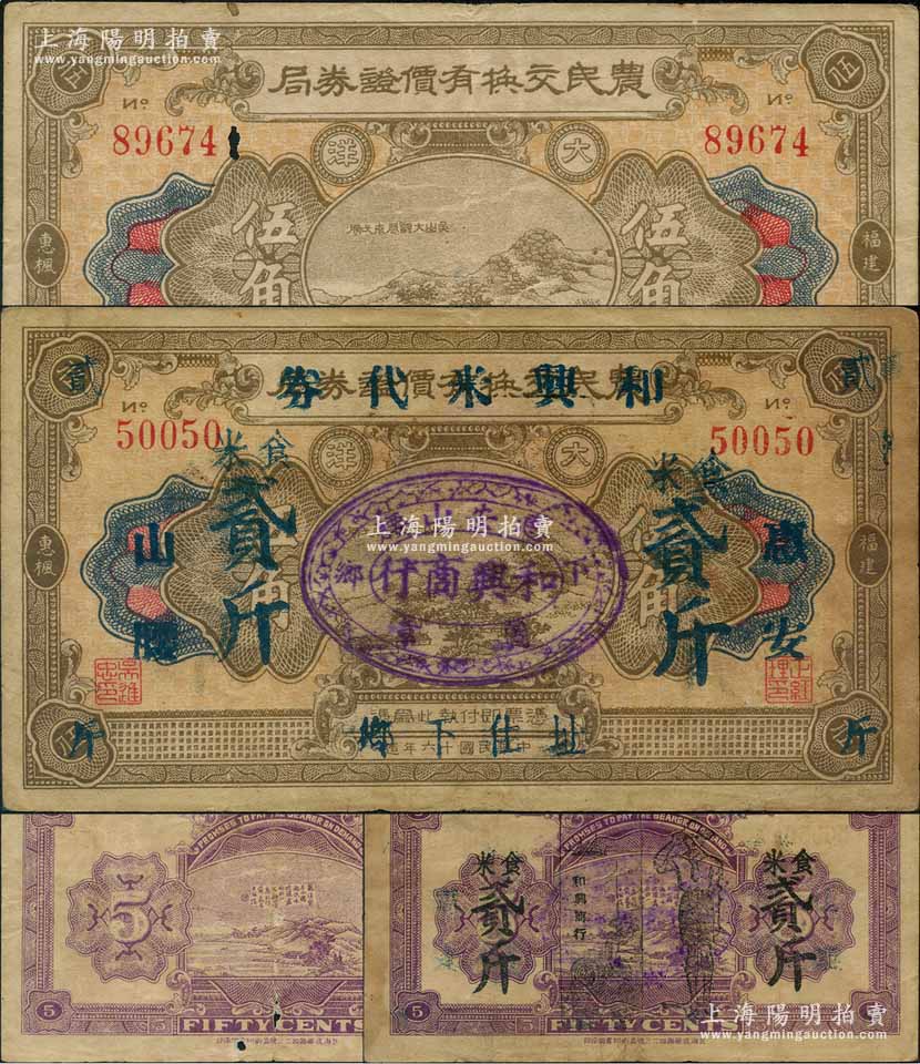 福建民间钞票2种,详分:(福建惠枫)农民交换有价证券局1927年大洋伍角;(惠安)和兴米代券食米贰斤,由和兴商行利用原1927年惠枫农民交换有价证券局大洋伍角券所改印,乃属福建省金圆券时代之实物钞票;其中1枚有蛀孔,七至近八成新
