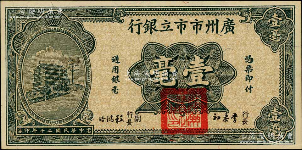 民国二十年(1931年)广州市市立银行壹毫,第一版李泰初·程鸿浩签名券;海外藏家出品,九八成新