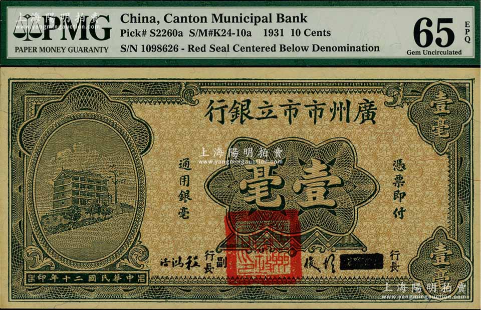 民国二十年(1931年)广州市市立银行壹毫,第二版胡俊·程鸿浩签名券;海外藏家出品,全新