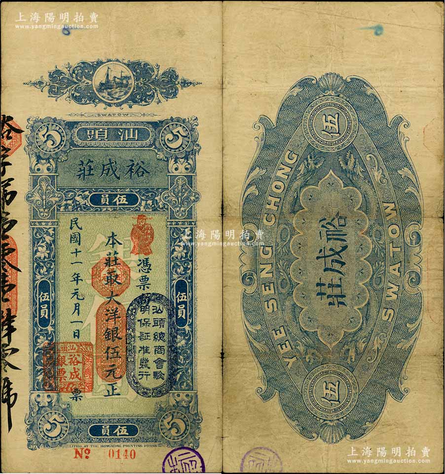 民国十一年(1922年)汕头·裕成庄大洋银伍元,上盖“汕头总商会验明保证准发行”戳记;海外藏家出品,近八成新