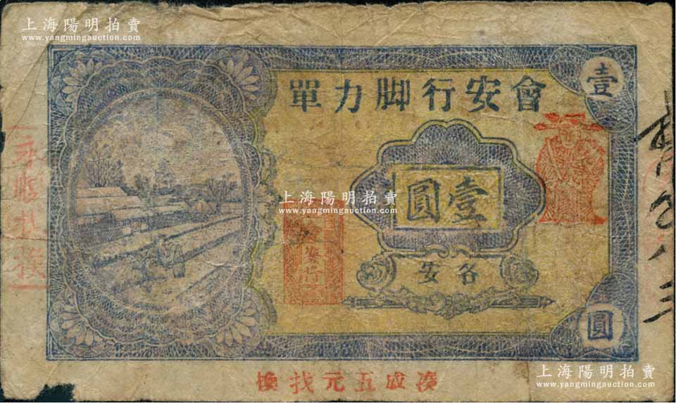 1948年(各安)会安行脚力单金圆壹圆,背印“金圆”字样,属广东潮汕陆丰县金圆券时代辅币,罕见,七成新