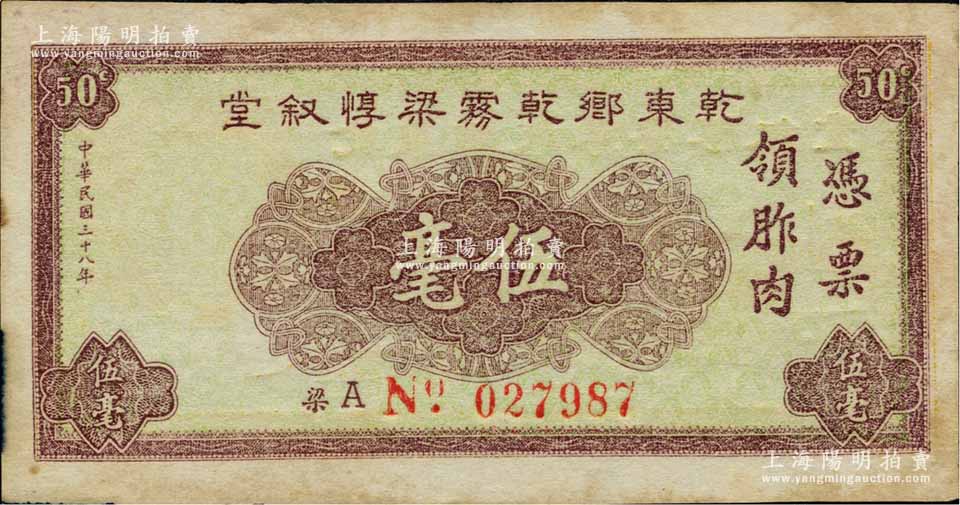 民国三十八年(1949年)乾东乡乾雾梁惇叙堂伍毫,广东中山县(今属珠海)金圆券时代地方辅币,背印东桥图,少见,八五成新