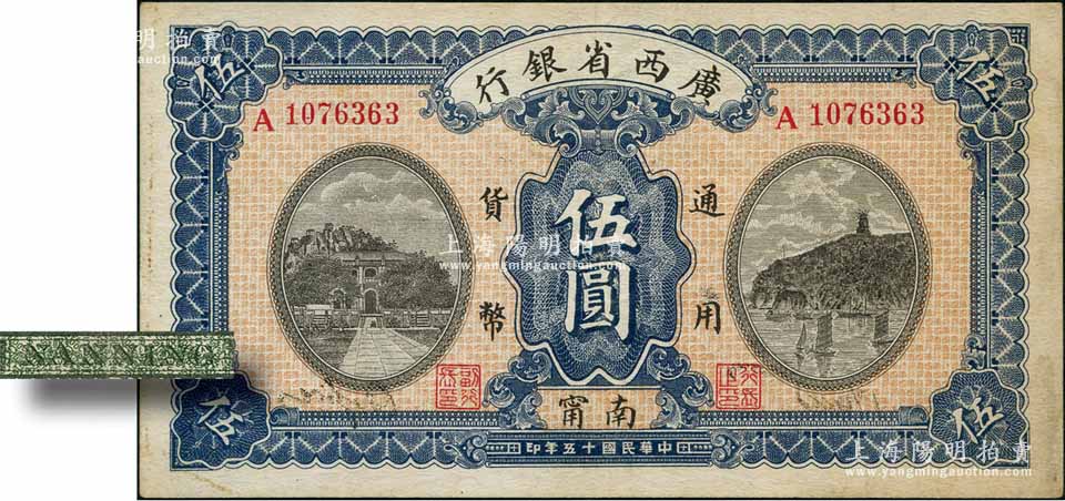 民国十五年(1926年)广西省银行伍圆,南甯地名(“甯”从用字),属第二版发行券,背面英文地名为绿色固定印刷;江南藏家出品,八五成新