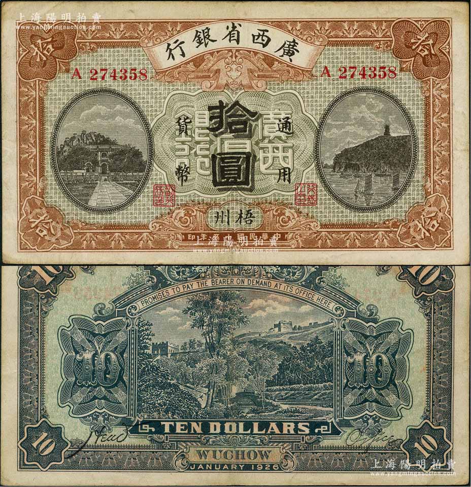 民国十五年(1926年)广西省银行拾圆,梧州地名,属第二版发行券,背面英文地名为固定印刷;资深藏家出品,八五成新