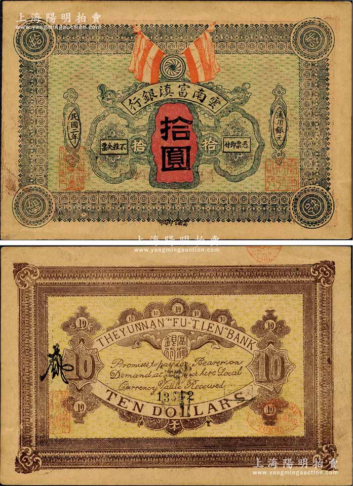 民国二年(1913年)云南富滇银行通用银元拾圆,资深藏家出品,源于日本名家森本勇先生之旧藏,少见,中未折九成新