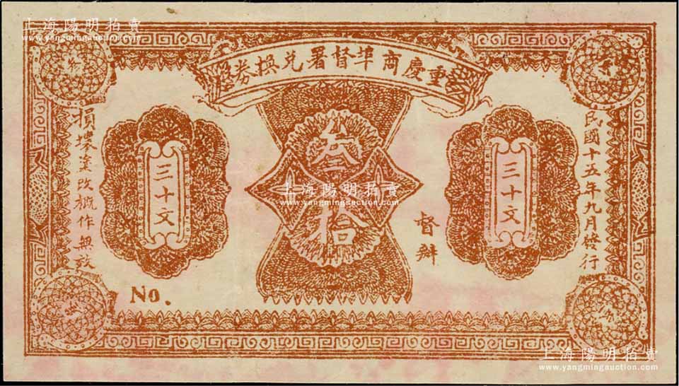 民国十五年(1926年)重庆商埠督署兑换券叁拾文,单面印刷,未正式发行,应属军阀唐式遵或潘文华氏任期内所印制;此券未见图谱记载,资深藏家出品,罕见,八五成新