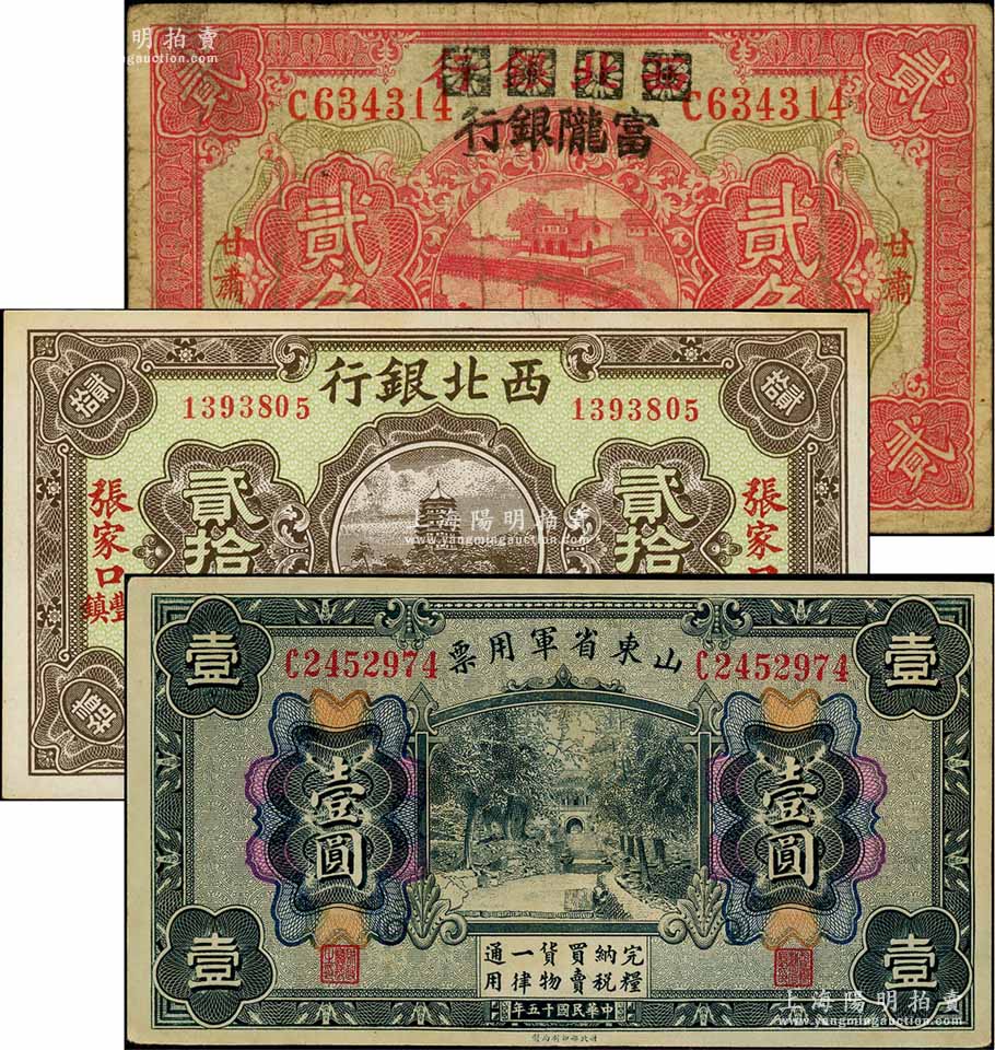 军票3种,详分:西北银行1925年铜元贰拾枚,张家口·丰镇地名;山东省军用票1926年壹圆,军阀张宗昌氏发行;西北银行改富陇银行1928年贰角,甘肃地名;江南藏家出品,七至九五成新