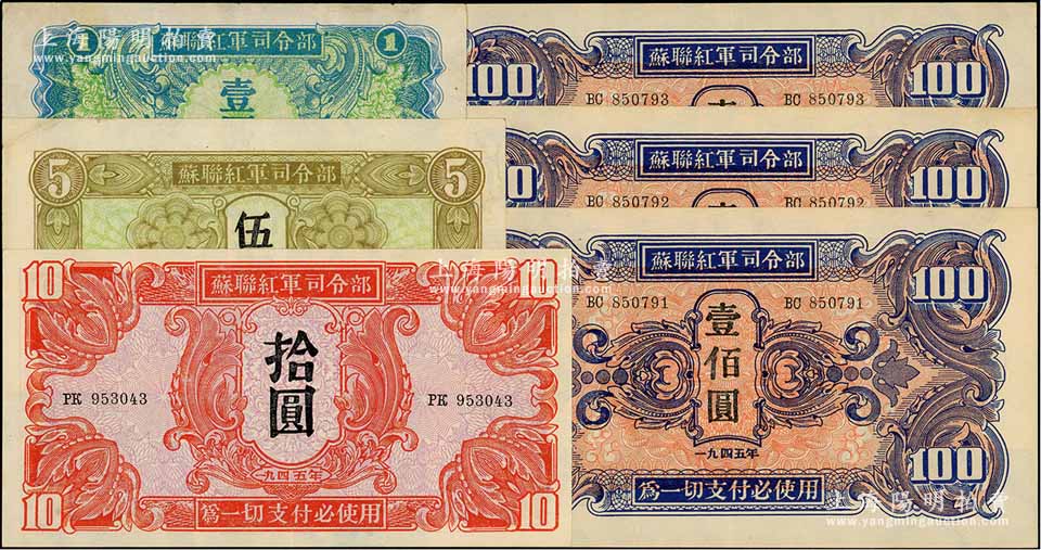 1945年苏联红军司令部军票共6枚,详分:壹圆、伍圆、拾圆各1枚,壹佰圆3枚连号;资深藏家出品,八至九五成新