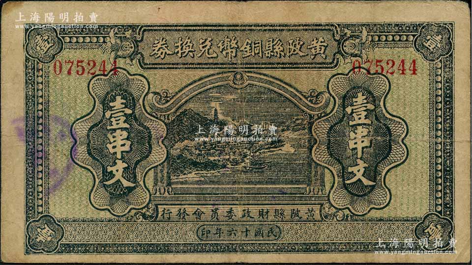 民国十六年(1927年)黄陂县铜币兑换券壹串文,由(湖北)黄陂县财政委员会发行,其上风景图颇为美观,背钤“黄陂县印”;此钞发行于大革命时期,极具史料研究价值,少见,八成新