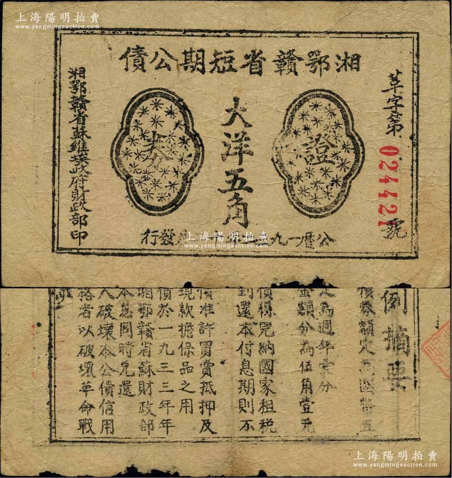 1932年湘鄂赣省短期公债证券大洋五角,由湘鄂赣省苏维埃政府财政部发行,背印条例摘要,少见,原票七成新
