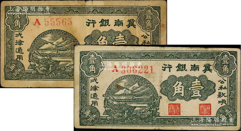 1939年冀南银行壹角共2枚不同,分别为5位数和6位数号码券,其中5位数号码券属第一版发行;资深藏家出品,七至八成新