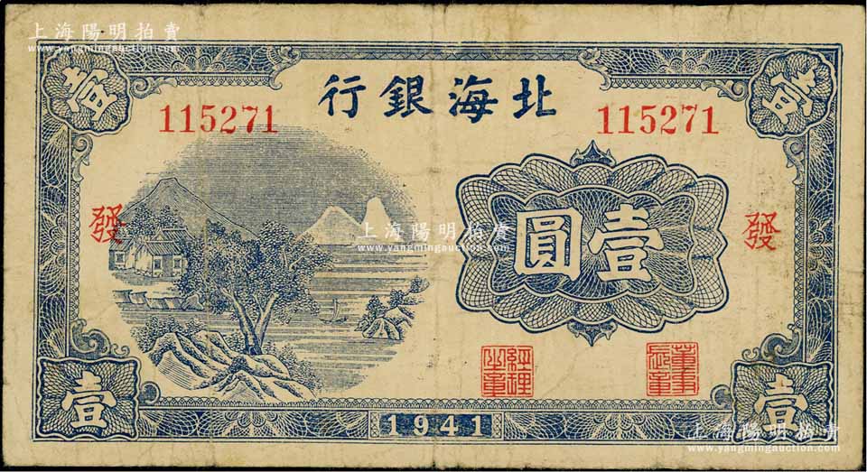 1941年北海银行蓝色山水风景图壹圆,大号码券,加印“发”字;资深藏家出品,少见,原票七五成新