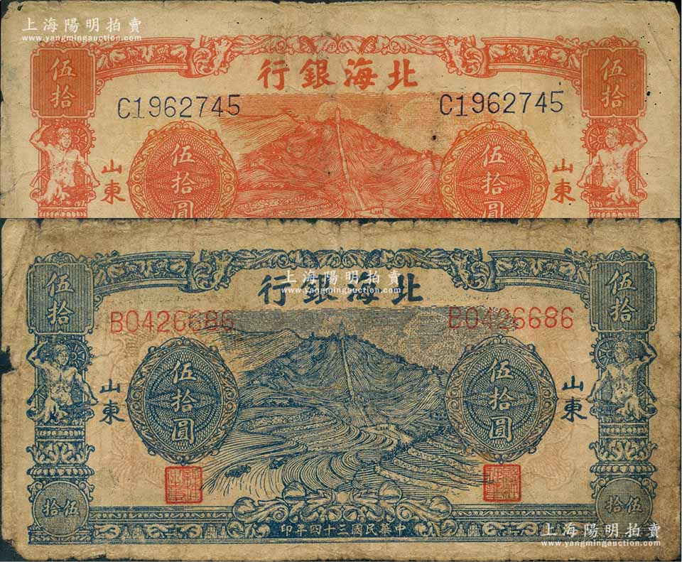 民国三十四年(1945年)北海银行山景梯田图桔色伍拾圆、蓝色伍拾圆共2枚不同,山东地名;资深藏家出品,少见,原票六五至七成新