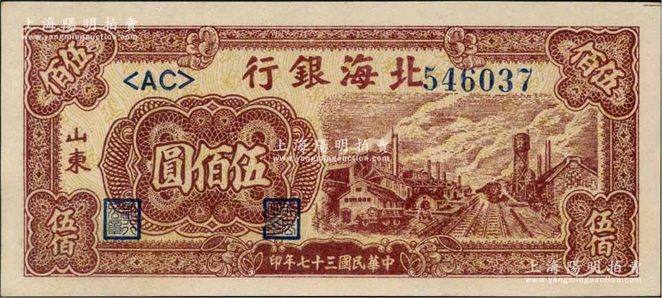 民国三十七年(1948年)北海银行棕红色工厂铁路图伍佰圆,山东地名,一流品相,九八成新