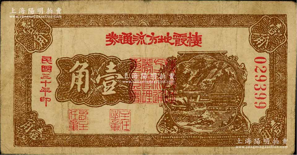 民国三十年(1941年)棲霞地方流通券壹角,胶东解放区发行,用于弥补北海银行辅币券之不足;资深藏家出品,原票七五成新
