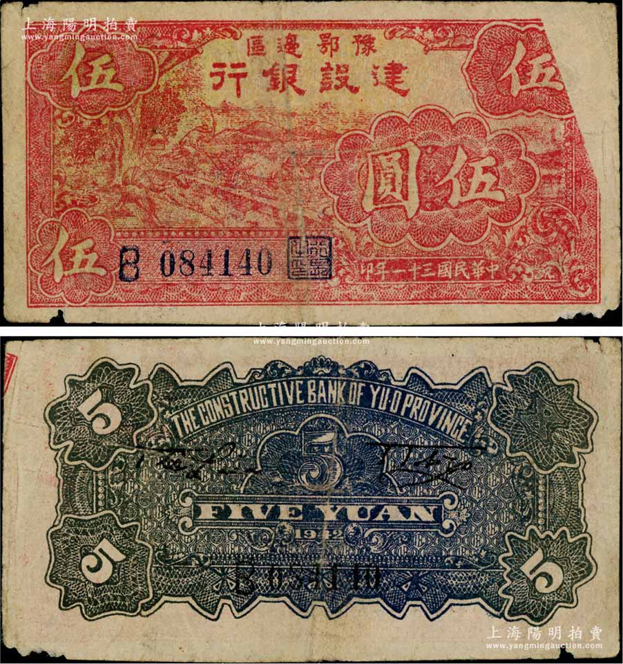 民国三十一年(1942年)豫鄂边区建设银行红色牛耕地图伍圆,错版券·正面右上角图案漏印;资深藏家出品,原票七成新