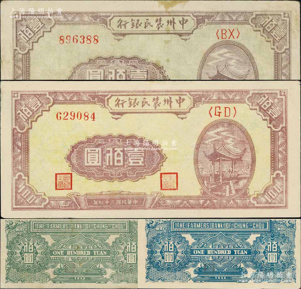 民国三十七年(1948年)中州农民银行凉亭图壹佰圆共2枚不同,其背面颜色分别为绿色版和蓝色版;资深藏家出品,八至九五成新