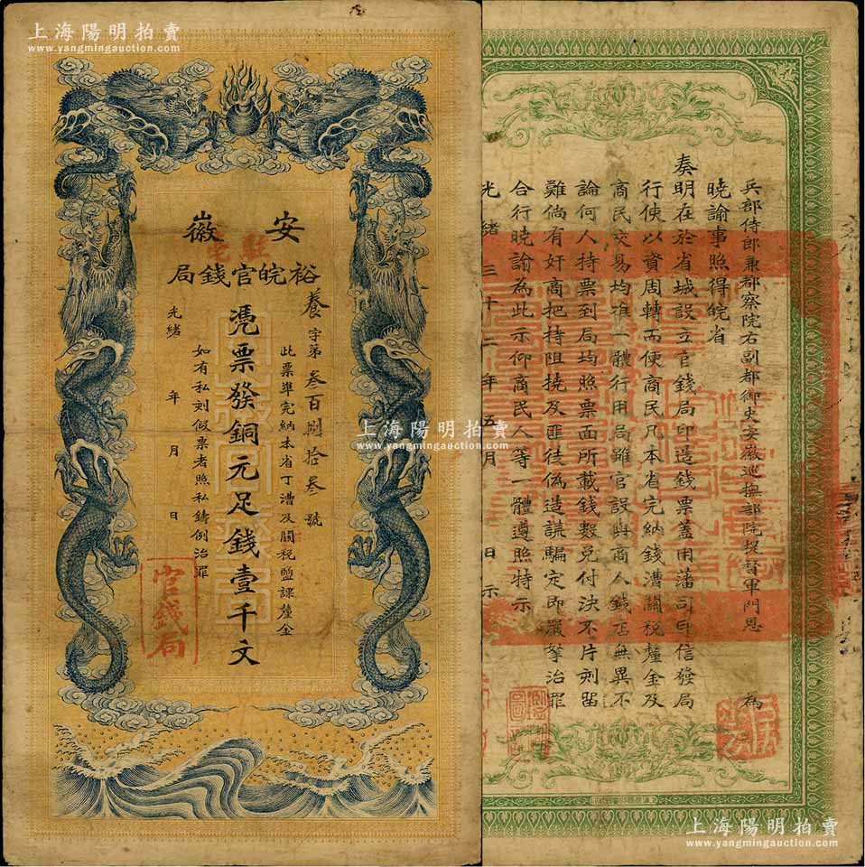 光绪三十二年(1906年)安徽裕皖官钱局铜元足钱壹千文,加盖“驻亳”(亳州)地名;江南藏家出品,原票近八成新