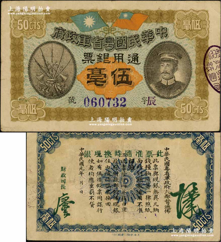 民国元年(1912年)中华民国粤省军政府通用银票伍毫,上印陈炯明像,背印粤省军政府大都督通告;资深藏家出品,八成新
