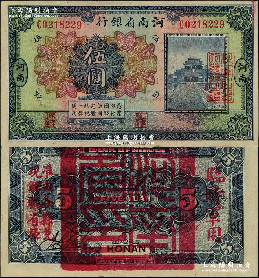 民国十二年(1923年)河南省银行伍圆,背盖“河南省印”大官印及“临时军用”等字样,大字版;资深藏家出品,九五成新