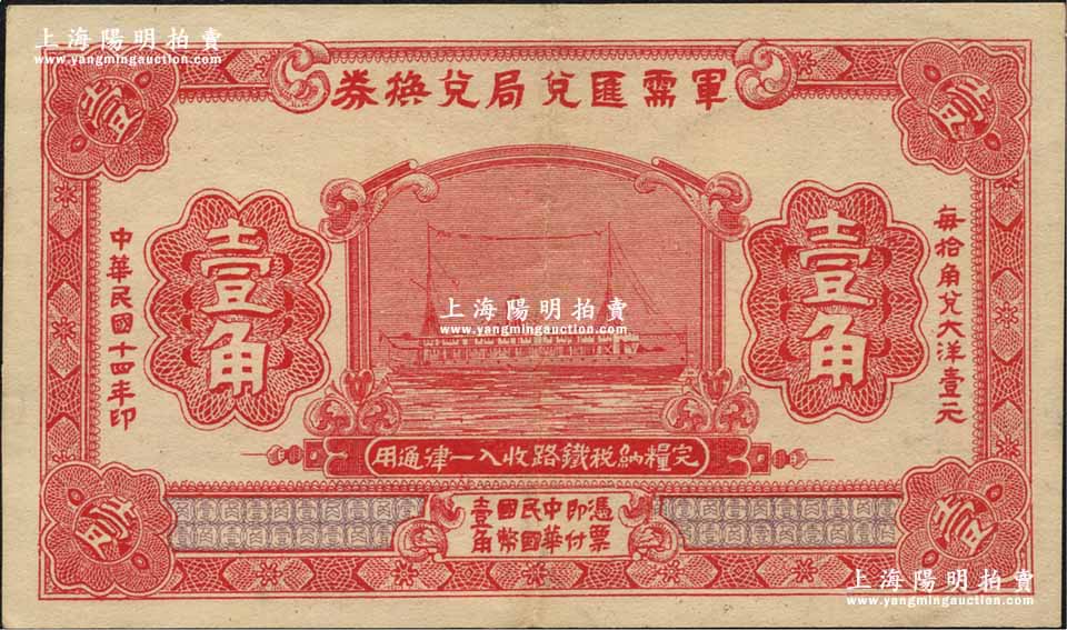 民国十四年(1925年)军需汇兑局兑换券壹角,由直系军阀吴佩孚之讨贼联军总司令部发行于汉口等地;资深藏家出品,源于日本名家森本勇先生之旧藏,九成新