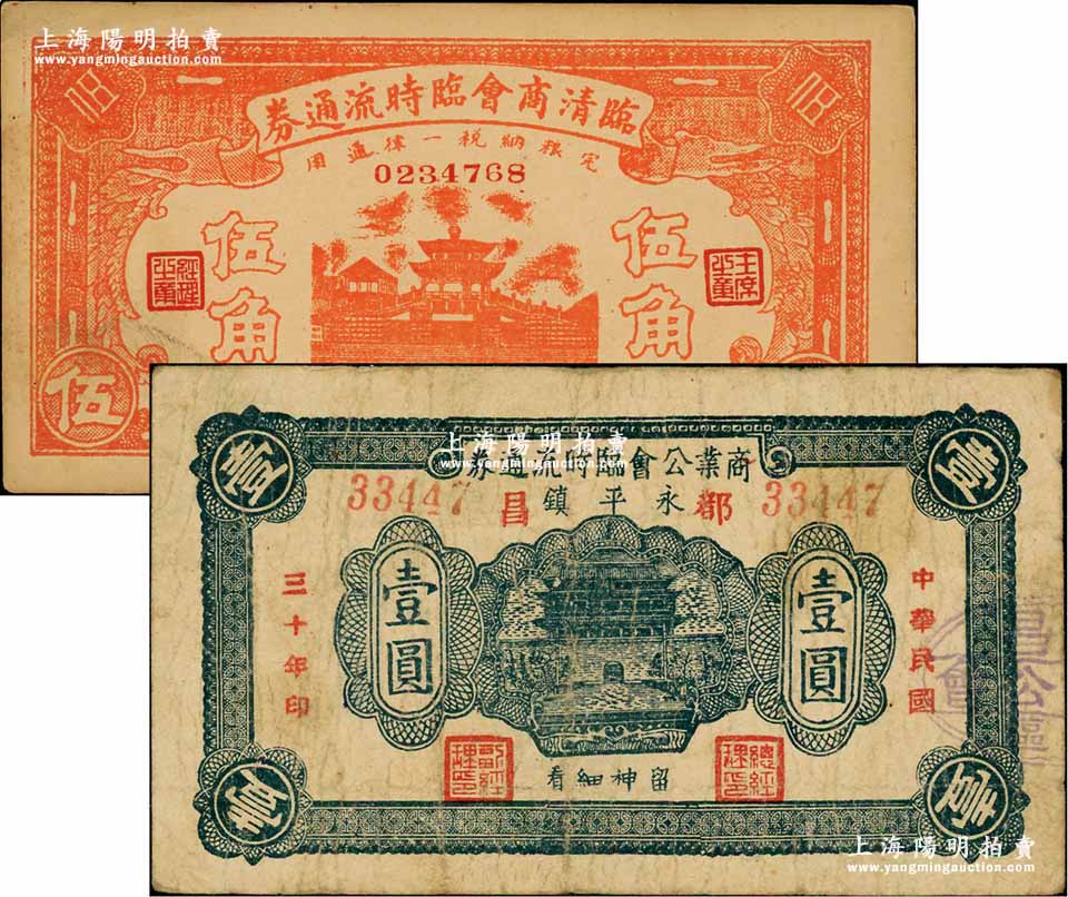山东商会纸币2种,详分:临清商会临时流通券1938年伍角、(都昌)永平镇商业公会临时流通券1941年壹圆;澳门陈耀光先生藏品,七至九成新