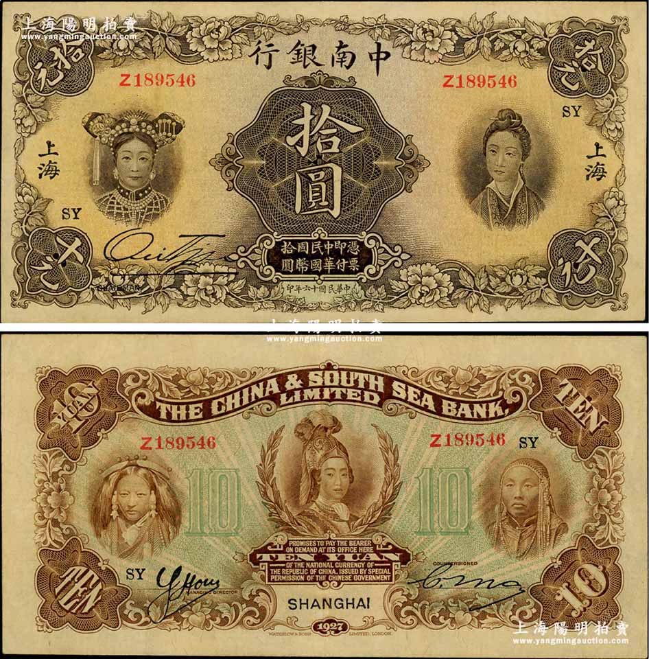 民国十六年(1927年)中南银行五女图拾圆,上海地名,加印领券“SY”字样,已属所见之上佳品相;江南藏家出品,九成新