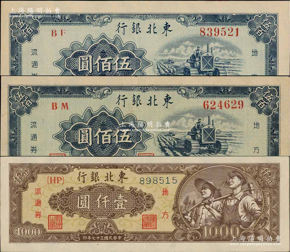 东北银行纸币3枚,详分:1948年工农图壹仟圆,1950年伍佰圆2枚;前辈藏家出品,八至九成新