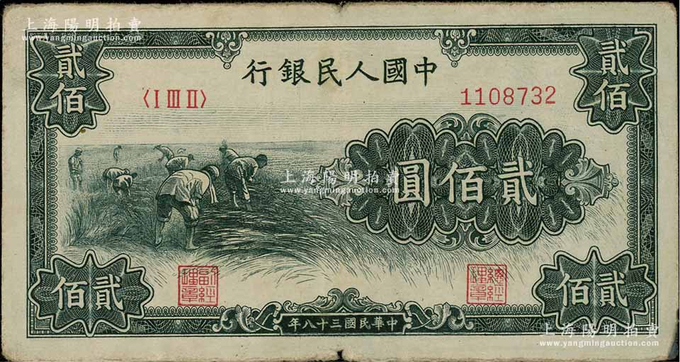 第一版人民币“割稻图”贰佰圆,前辈藏家出品,原票近八成新