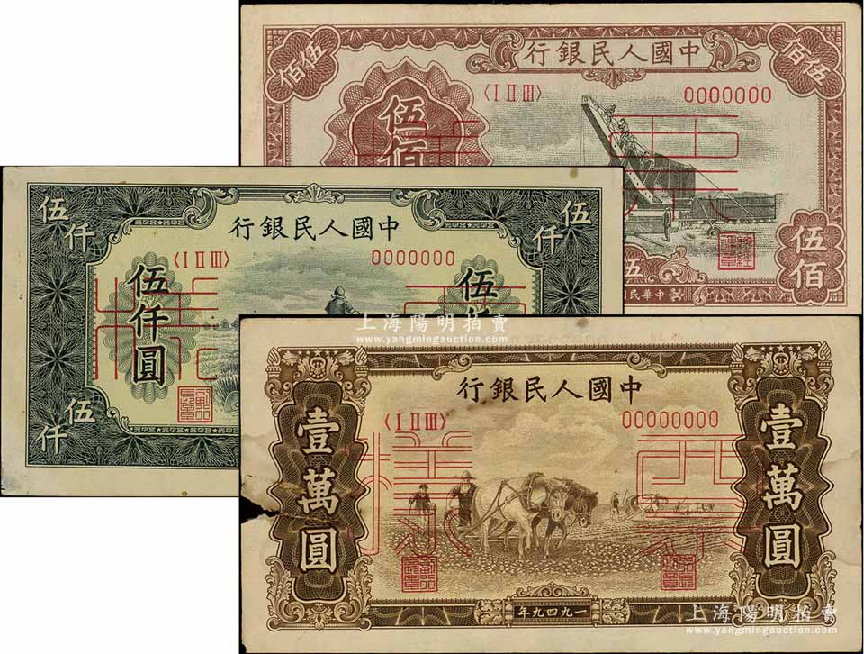 第一版人民币“起重机”伍佰圆票样、“单拖拉机”伍仟圆票样、“双马耕地图”壹万圆票样共3种不同,正背共6枚,其中1枚边有缺损,整体约七至九成新,敬请预览