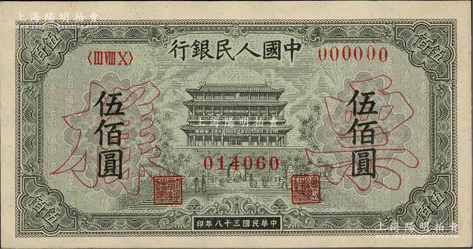 第一版人民币“正阳门”伍佰圆仅正面票样,九五成新