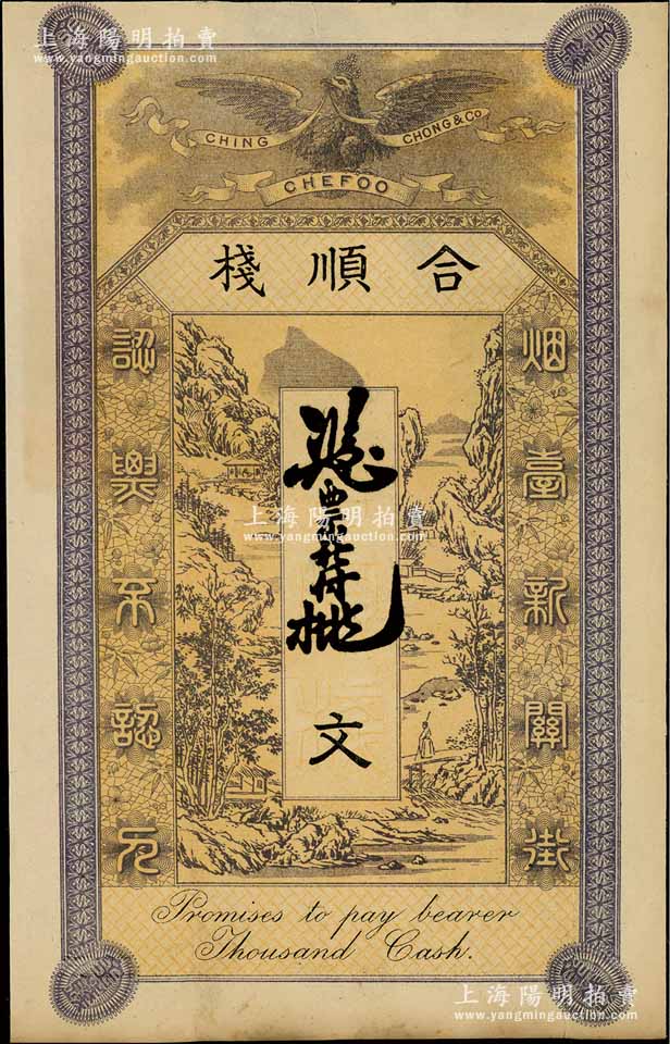 清末(烟台)合顺栈钱票未填用,“烟台新关街”地名,上印皇冠飞鹰和山水风景图,罕见,八五成新