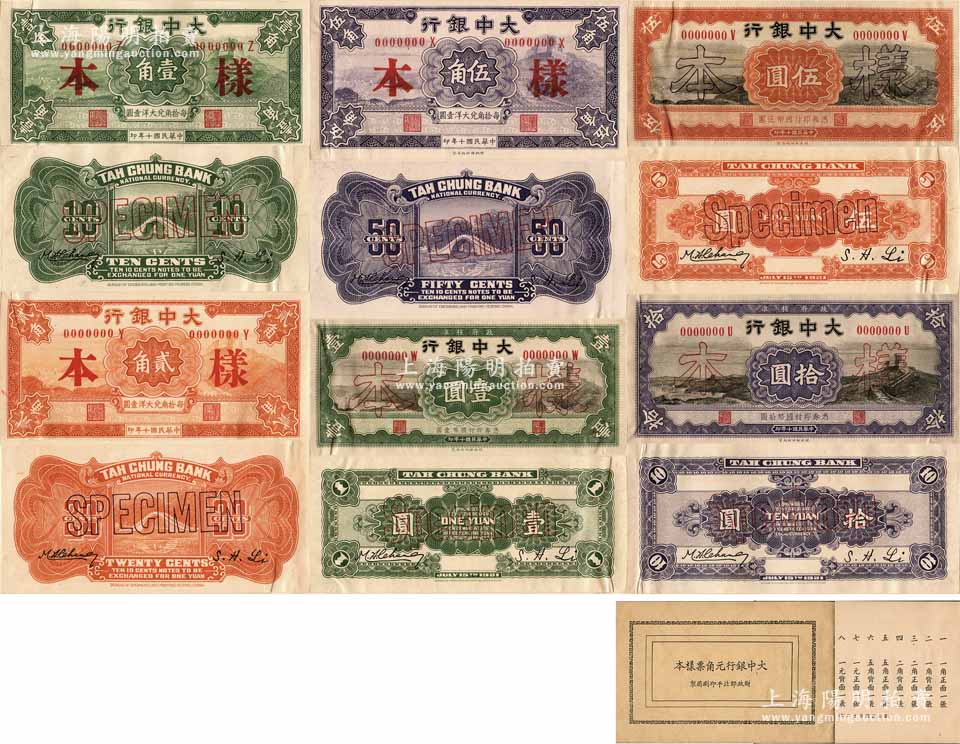 民国十年(1921年)大中银行壹角、贰角、伍角、壹圆、伍圆、拾圆样本册1本,内含正背样本共12枚大全套,均为无地名券(一般所见多为青岛地名券);柏文先生藏品,罕见,九八成新