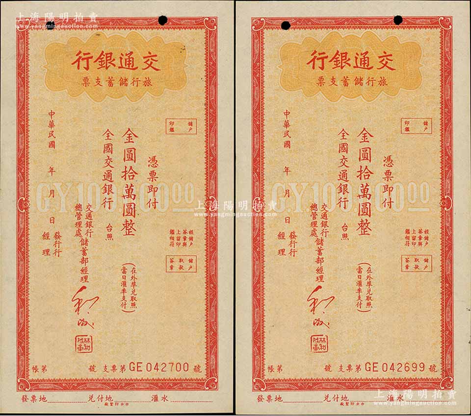 交通银行旅行储蓄支票金圆拾万圆共2枚连号,未签发行用,江南藏家出品,未折九成新