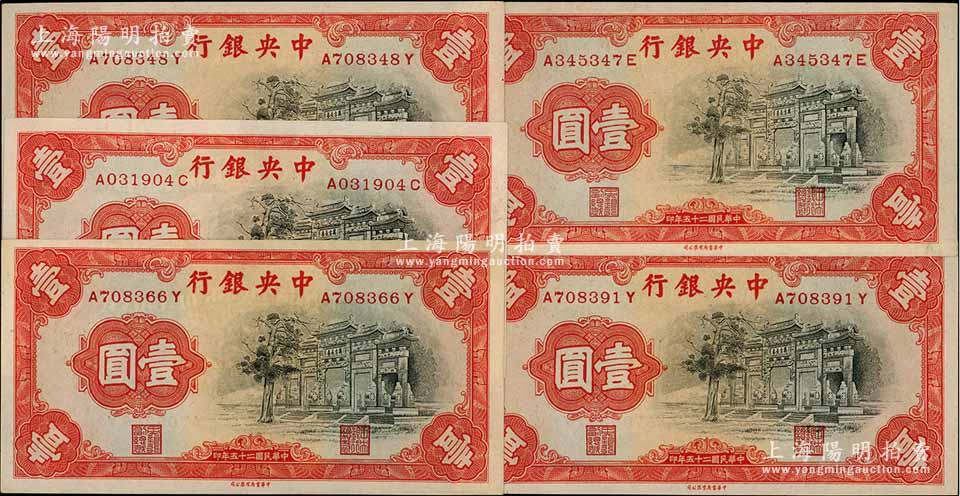 民国二十五年(1936年)中央银行中华版“黑牌坊”壹圆共5枚,前后字轨;前辈藏家出品,原票九五至全新