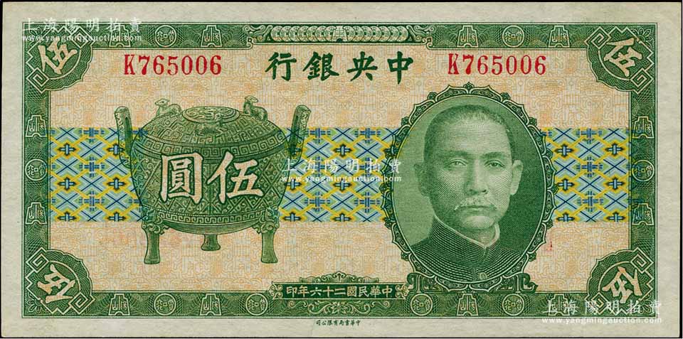 民国二十六年(1937年)中央银行中华版宝鼎图伍圆,单字轨,孔祥熙·李觉签名,九五成新