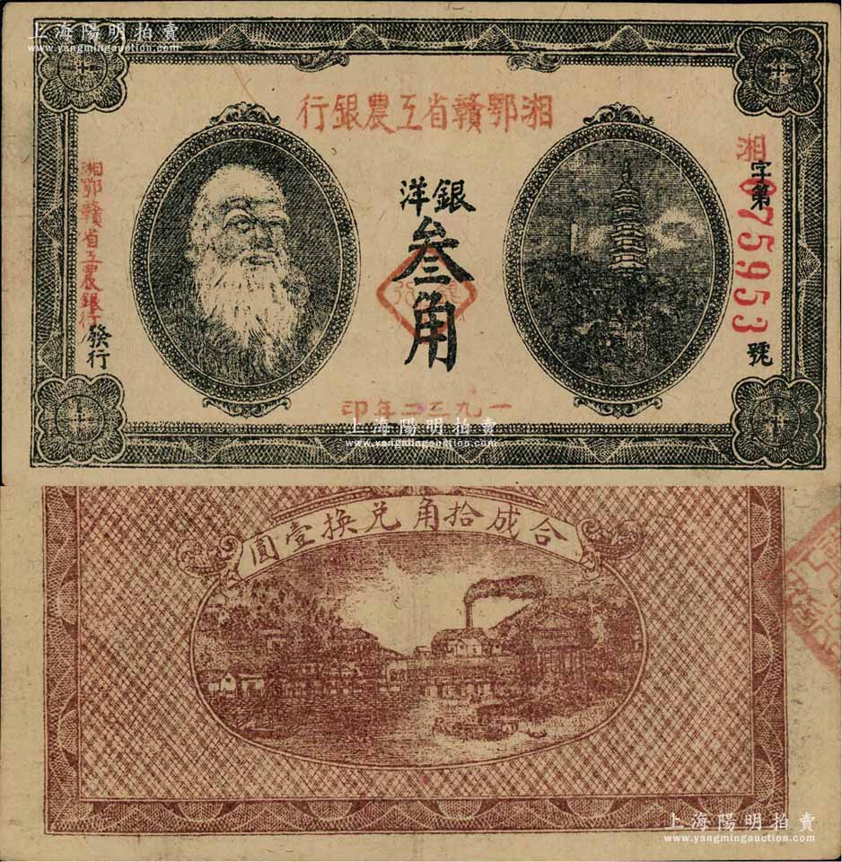 1932年湘鄂赣省工农银行银洋叁角,上印马克思头像;源于藏家出品,且属难得之上佳品相,近九成新