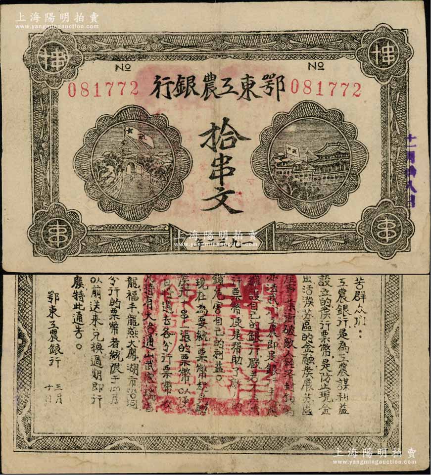 1932年鄂东工农银行拾串文,背印劳苦群众告示;海外藏家出品,且品相难得,八五成新