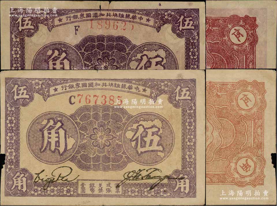 1933年中华苏维埃共和国国家银行伍角共2枚不同,分别为C字轨厚纸版和F字轨薄纸版,且两券之正背面颜色各不相同;海外藏家出品,七至八成新