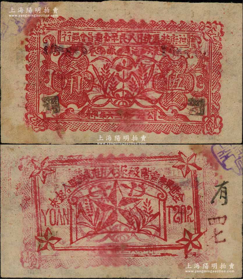 1936年神府特区抗日人民革命委员会银行伍角纸币,背印五角星及“全世界无产阶级及被压迫民族联合起来”之口号;此乃唯一在名称上印有“抗日”字样的银行,堪称中国革命根据地钞票之一大名珍;海外回流品,原票八成新