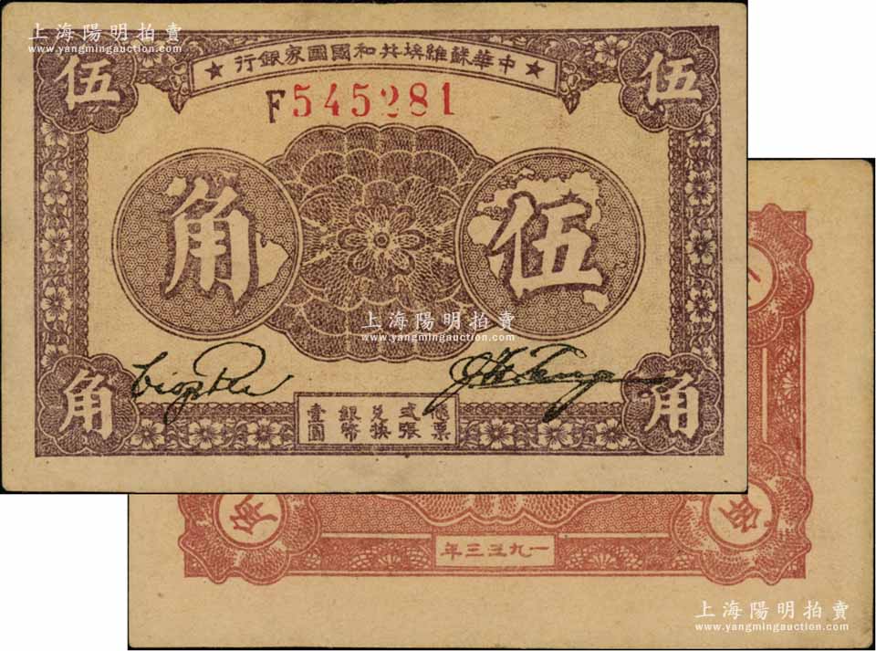 1933年中华苏维埃共和国国家银行伍角,F字轨,厚纸版,背面枣红色印刷;海外藏家出品,上佳品相,九成新