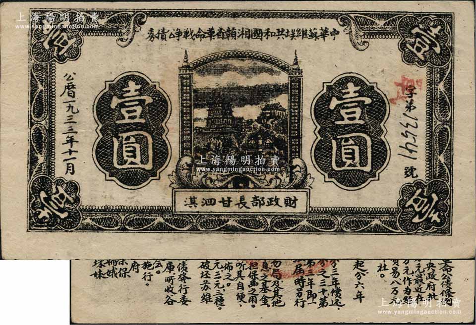 1933年11月中华苏维埃共和国湘赣省革命战争公债券黑色壹圆,红色“战”字冠字版,由财政部长甘泗淇署名,属第二期发行,背印条例文字,少见,九至九五成新