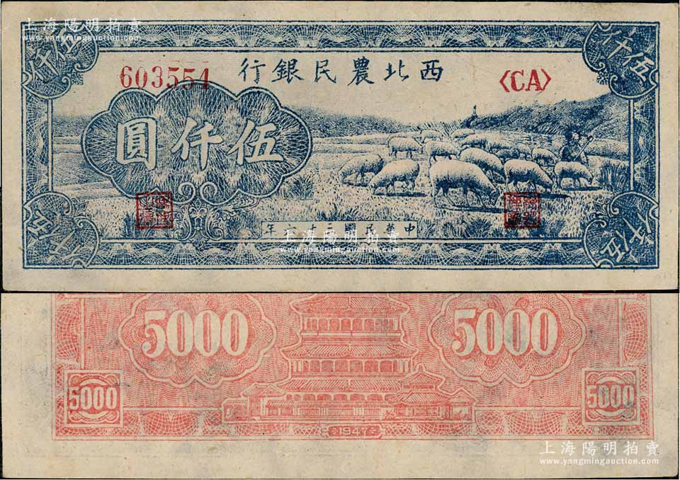 民国三十六年(1947年)西北农民银行蓝色羊群图伍仟圆,江南藏家出品,上佳品相,未折九五成新