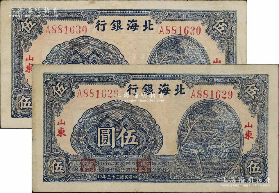 民国三十三年(1944年)北海银行蓝色灌溉图伍圆共2枚连号,薄纸版大号码,红字“山东”地名,其背面英文地名错印成“GIAO DUNG”(胶东),原票八成新