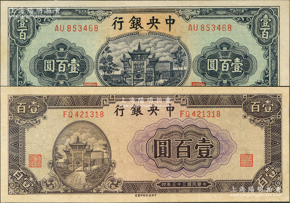 民国三十三年(1944年)中央银行信托版牌坊图绿色壹百圆、紫色壹百圆共2枚不同,九五至九八成新